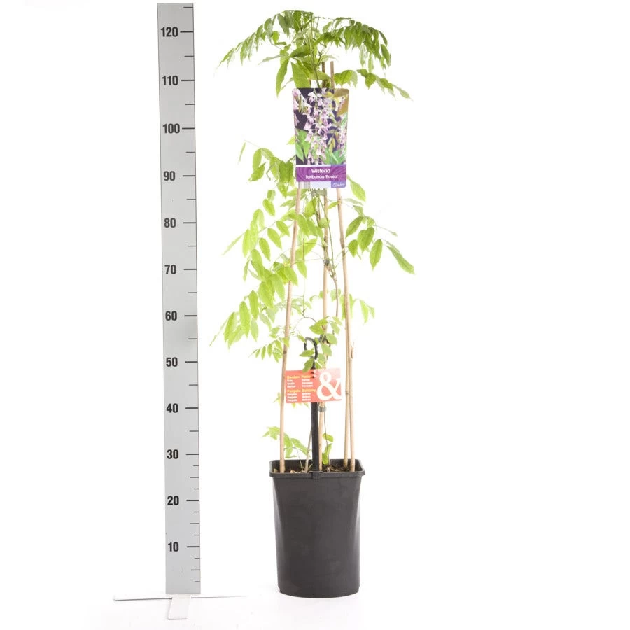 Wisteria floribunda ‘Rosea’ bloeit in april, mei en juni.