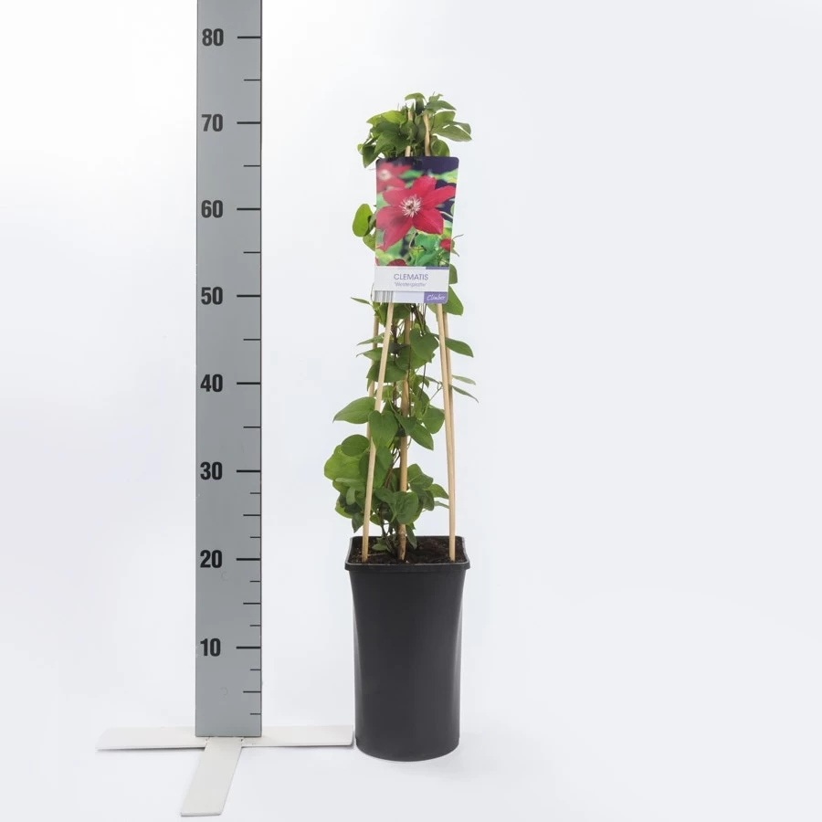 Bosrank (Clematis ‘Westerplatte’) heeft een paarse bloem met een bordeaux rood en wit hart, en bloeit in juli-september. De Clematis ‘Westerplatte’ heeft een volwassen hoogte van 2 meter en bereikt deze in ongeveer 3 jaar. De Clematis ‘Westerplatte’ is bladverliezend in de winter, en is zeer winterhard, temperaturen tot -34 graden Celsius zijn geen enkel probleem. U snoeit deze Bosrank aan het eind van de winter/begin voorjaar. Als u de Bosrank (Clematis ‘Westerplatte’) wilt gebruiken langs schutting, muur, of gevel, raden wij 3 planten per strekkende meter aan voor een mooi vol resultaat. Bij lagere schuttingen of muren kunt u dit aantal verminderen omdat de Bosrank wel ruimte nodig heeft om te kunnen groeien.