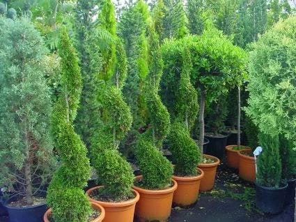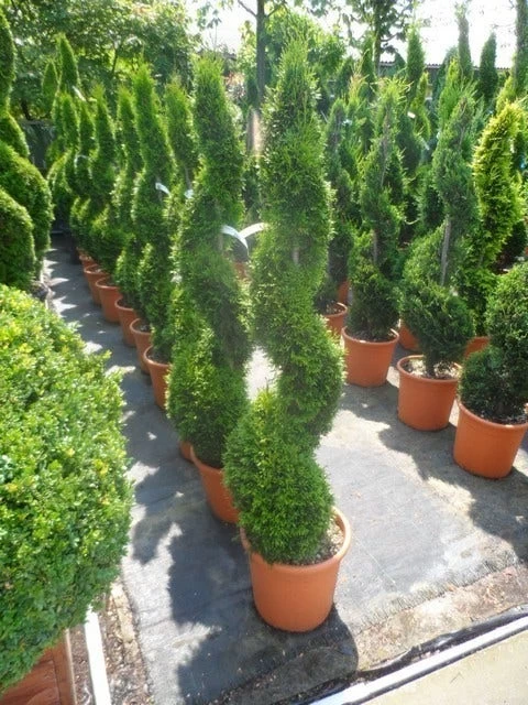 Thuja occidentalis ‘Smaragd’ in spiraalvorm.