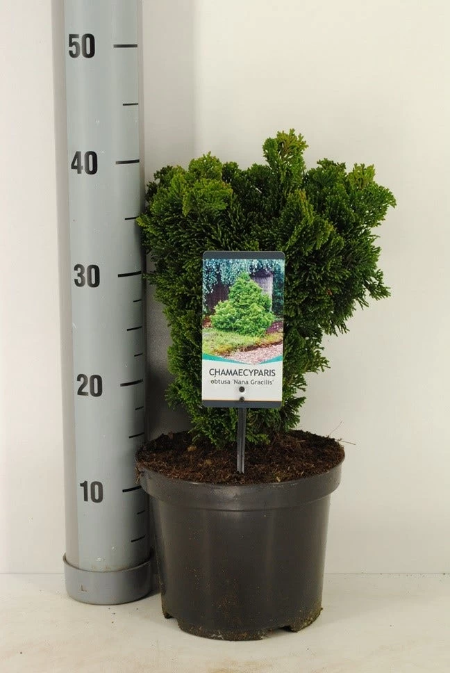 Chamaecyparis obtusa ‘Nana Gracilis’ is een dwergvorm met een compacte , breed zuilvormige groeiwijze. Hoogte 1 – 2 m, breedte tot 1 m. Compacte groeiwijze. Langzaam groeiend. Loof heldergroen. Mooie solitairplant. Humusrijke grondsoort.