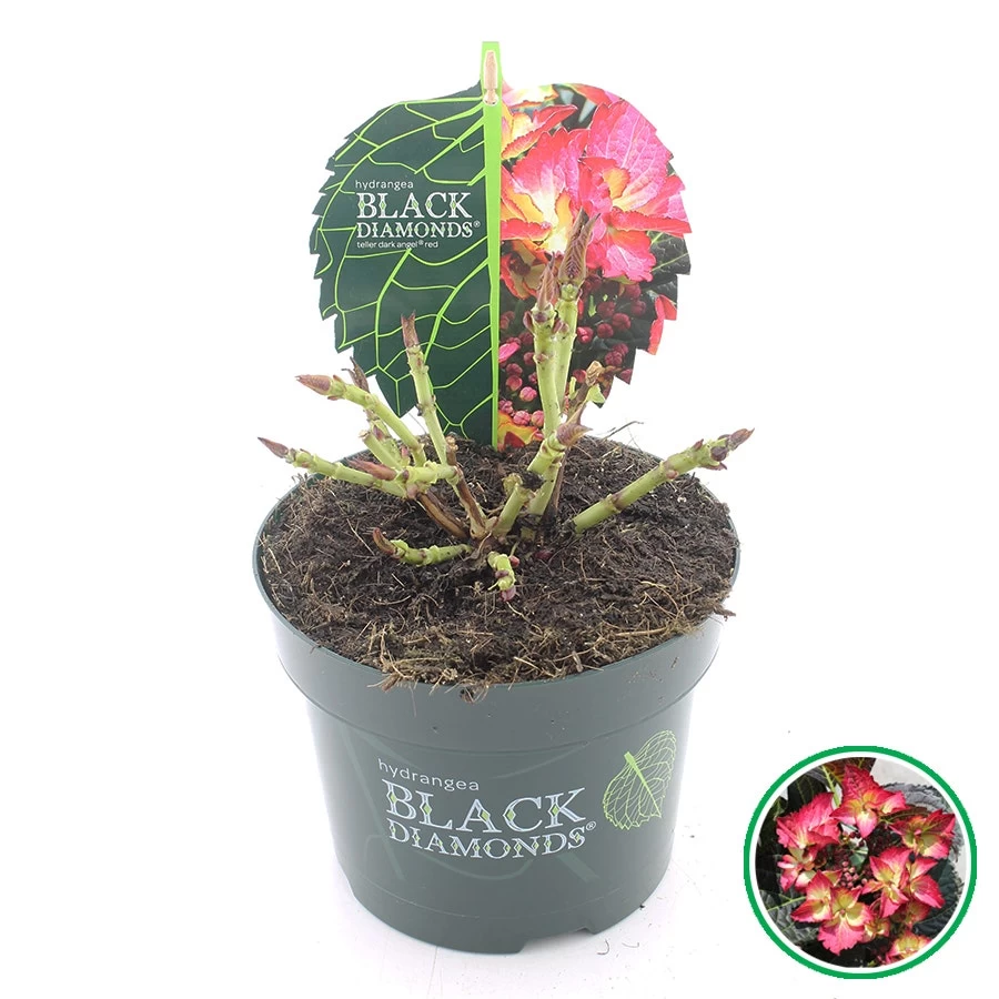 Hydrangea Black Diamonds Dark Angel is een Hortensia met donker blad met groene nerven. Hydrangea Black Diamonds Dark Angel bloeit met rode bloemen.