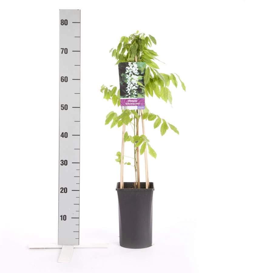 Wisteria floribunda ‘Alba’, bloeit rond mei-juni met lange trossen vol met kleine witte bloemen, die licht geuren. Rond september is nog nabloei mogelijk.
