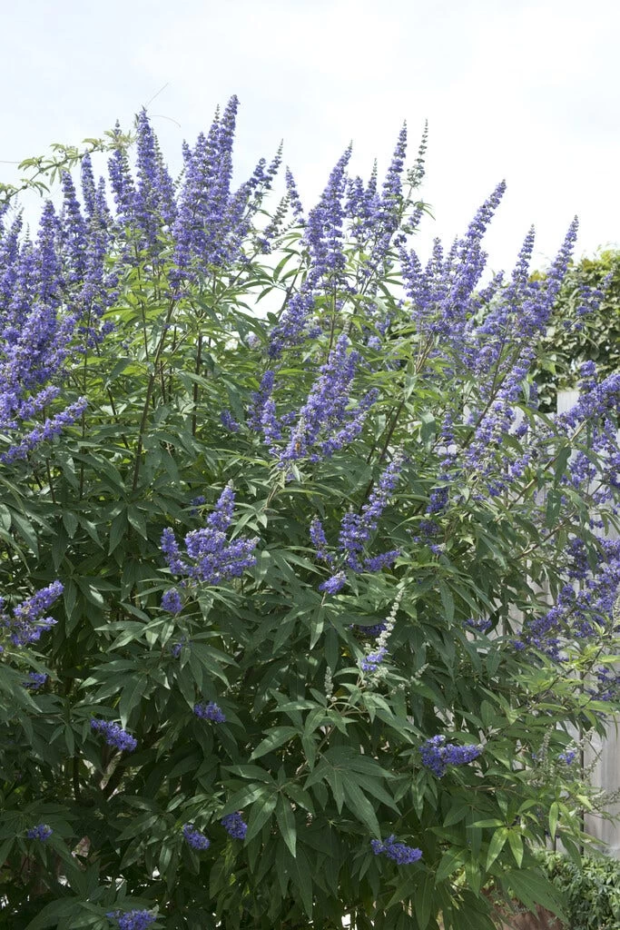 Vitex agnus-castus is een prachtig bloeiende struik die nog niet veel in de Nederlandse tuinen wordt gezien. Het is een soort die iets weg heeft van een vlinderstruik, maar dan met scherp handvormige bladeren.