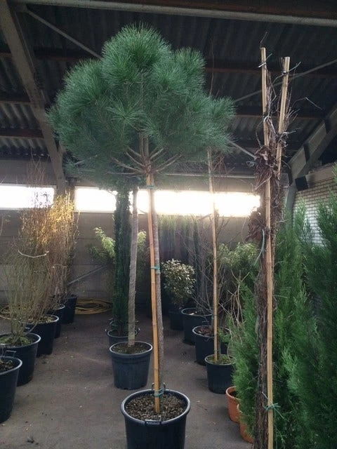 Deze Pinus pinea is als plant op stam gekweekt, hij is echter ook te verkrijgen als hoogstamboom (vertakking vanaf 180cm.)