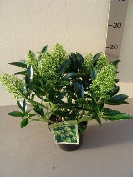 Deze Skimmia heeft langwerpige bladeren.